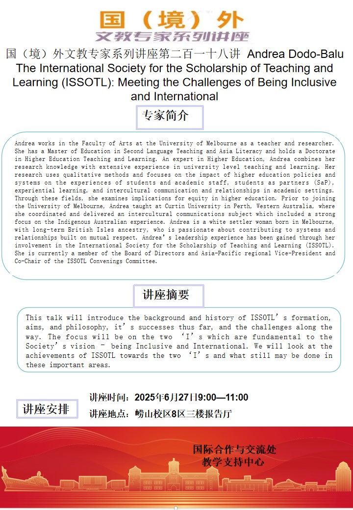• 国(境)外文教专家系列讲座第二百一十八讲-Andrea Dodo-Balu:The International Society for the Scholarship of Teaching and Learning (ISSOTL): Meeting the Challenges of Being Inclusive and International